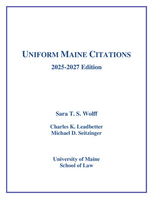 Originally prepared by Michael D. Seitzinger and Charles K. Leadbetter, two members of the Maine Bar, Uniform Maine Citations provides updated rules for the citation of Maine legal authorities, including constitutional provisions, statutory and legislative materials, judicial decisions, court rules, treatises, periodicals, and miscellaneous Maine authorities.